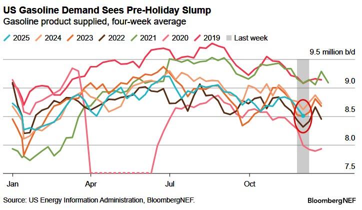 Piling on the bearish slide (bullish for Americans' pocketbooks), US gasoline demand continues to pull back heading into the final weeks of the year amid cold weather sweeping the country.