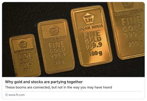 Not only are stocks partying like it’s 1999, as Ruchir Sharma notes, gold is partying like it’s 1979. “Historically, the correlation between them was zero. In the gold rush of the 1970s, stocks were dead in the water; in the stock boom of the 1990s, gold prices were falling. Now they’re rising together on a tide of liquidity,” he explains.