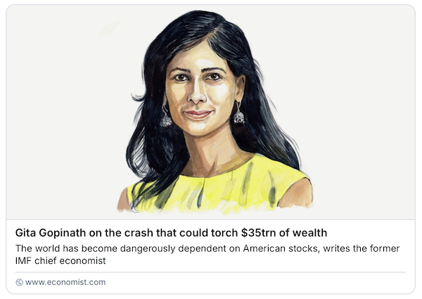 The problem, as Gita Gopinath writes, is that, “A market correction of the same magnitude as the dotcom crash could wipe out over $20T in wealth for American households, equivalent to roughly 70% of American GDP in 2024. This is several times larger than the losses incurred during the crash of the early 2000s.”