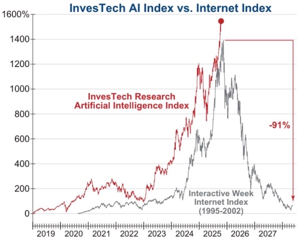 This tide of liquidity may be fueling another bubble. “The Investech AI Index has been riding a wave of ‘stock hyping’ announcements. However, these deal announcements boil down to something far less attractive and reminiscent of past bubbles: insidious vendor financing, circular money flows and leveraged debt accumulation,” reports Investech Research.