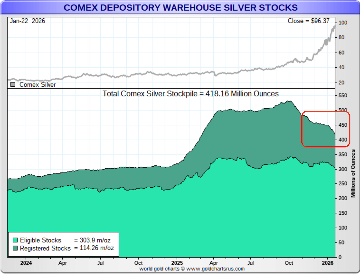 Silver continues to flow out of CME warehouses, as another ~4 million ounces reportedly left yesterday, with roughly 422 million ounces remaining. In total, about 110 million ounces have reversed course over the last few months.