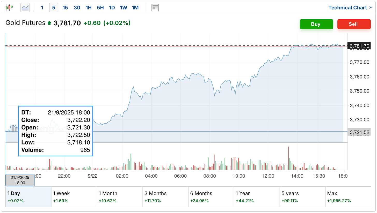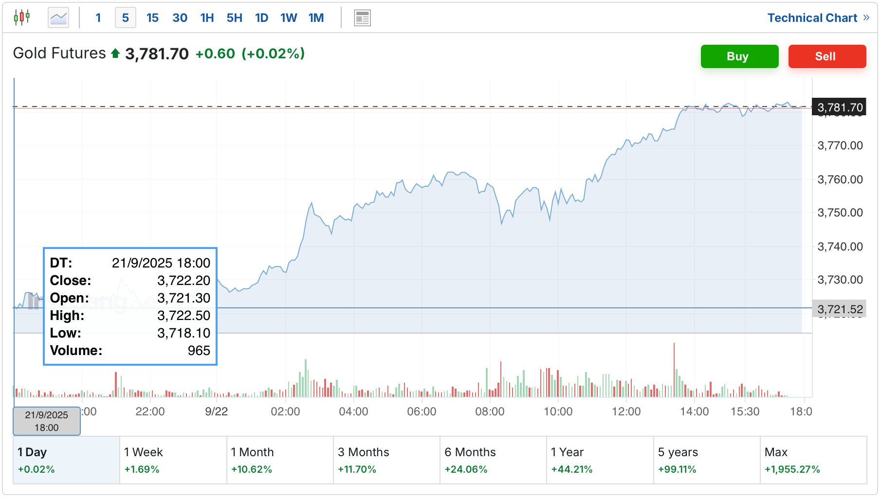 The gold futures were up $60 to $3,782, with $3,783.22 being the new official all-time record high.