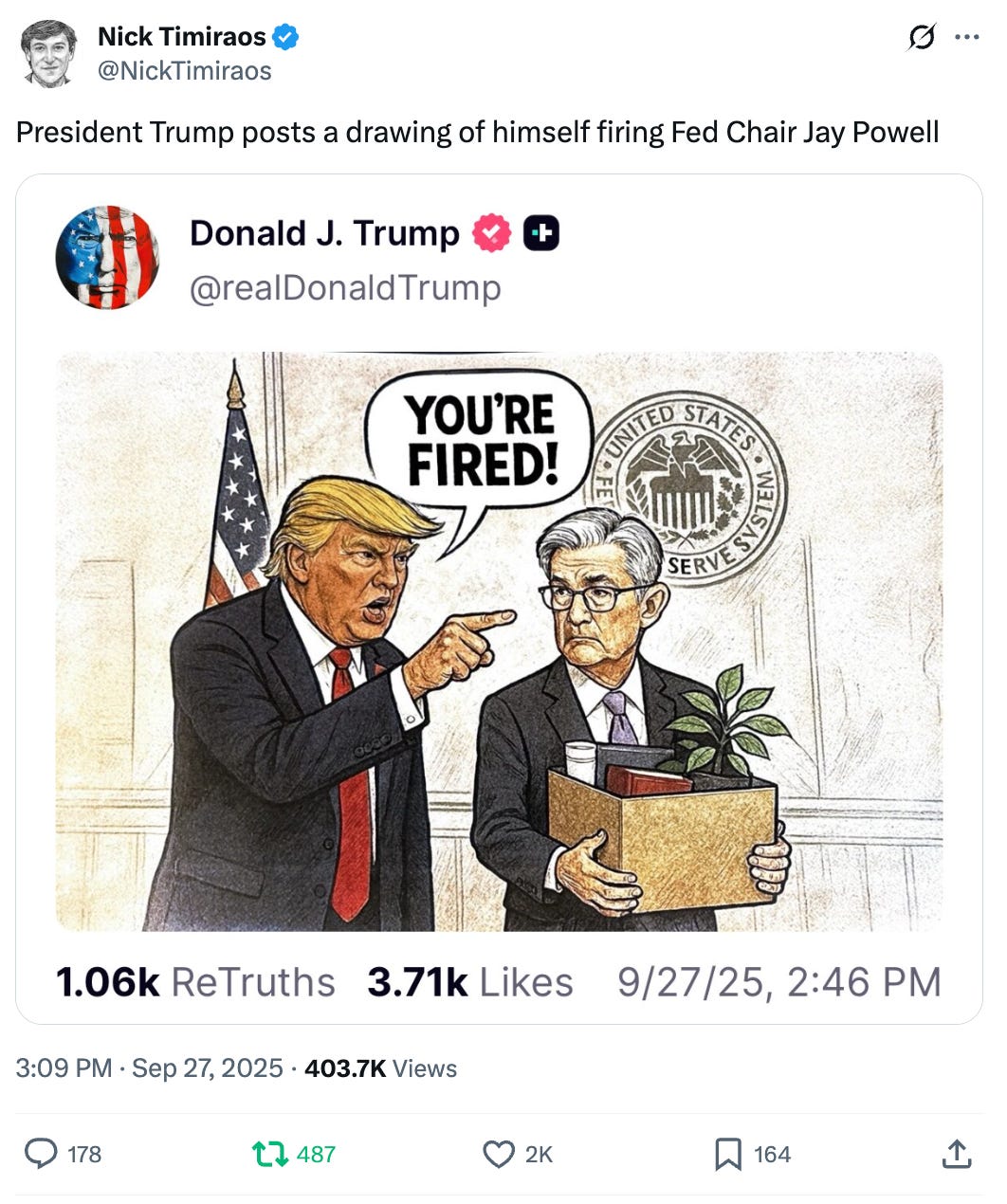 Meanwhile, we also have the Wall Street Journal reporting on how Donald Trump has posted a cartoon of him firing Jerome Powell.