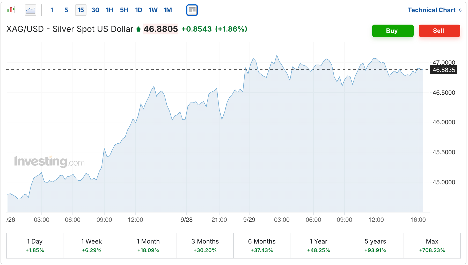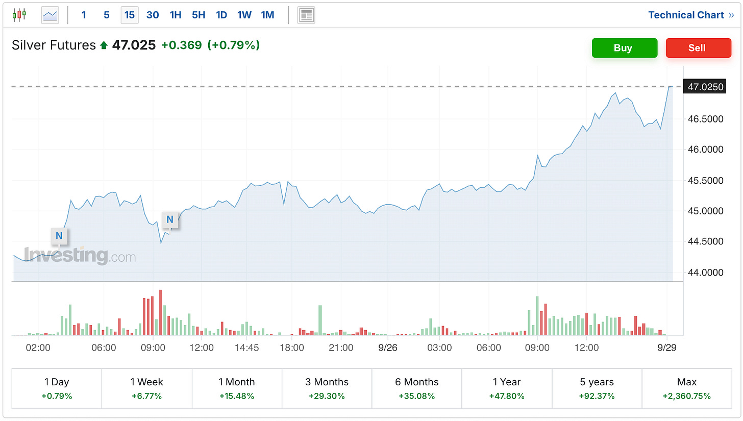 It seems like we’re at the point now where seeing the silver futures cross the next dollar handle higher is becoming almost a daily occurrence. As on Monday, the silver futures broke through the $47 level and are currently trading at $47.03.