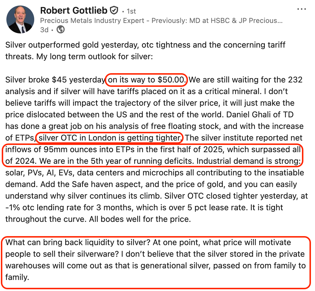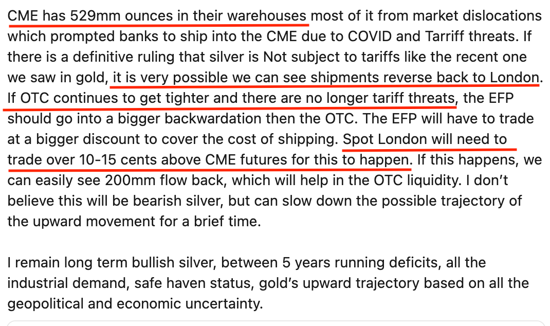 What that actually means about what the President may do is unknown. But I’m guessing it’s hard to imagine that this is reducing any of the current uncertainty in the markets, some of which is currently being reflected in the silver price. And as you may have noticed in Robert Gottlieb’s column, he also talked about how the remaining uncertainty around the silver tariffs has continued to be a problem with the metal flows.