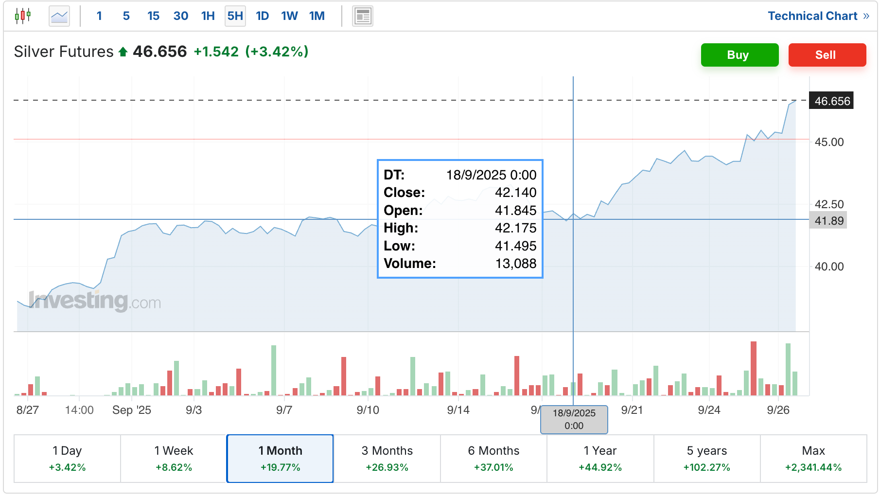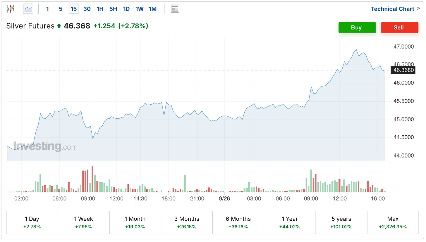 One day after silver soared through the $45 level for just the third time in history, today it has taken out the $46 mark.