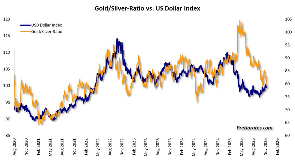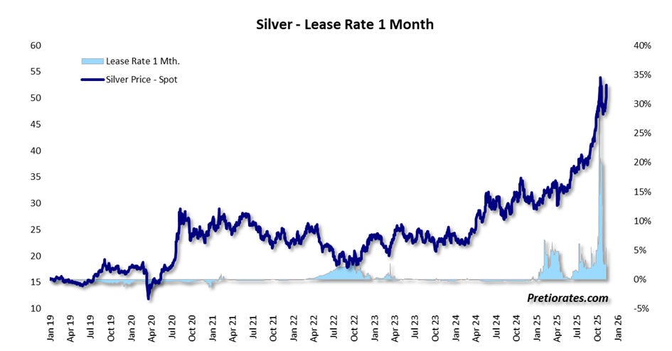 There is said to be a lot of Silver in global warehouses, but the figures are unclear. Estimates range from one to five billion ounces – however, a large portion of this is deposited for ETFs and therefore not freely available. The recent price increase has also fueled speculation about actual physical availability. We have previously pointed out the highly volatile lease rate, which recently exploded to 35% and has since settled down to around 5% – still a very high level historically.