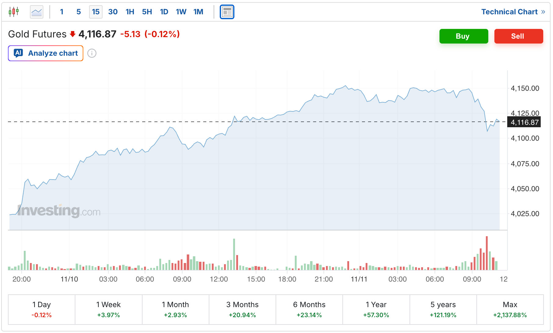 The gold futures had been rallying again, although they fell about $30 in the past two hours, and are now down $5 on the day to $4,117.