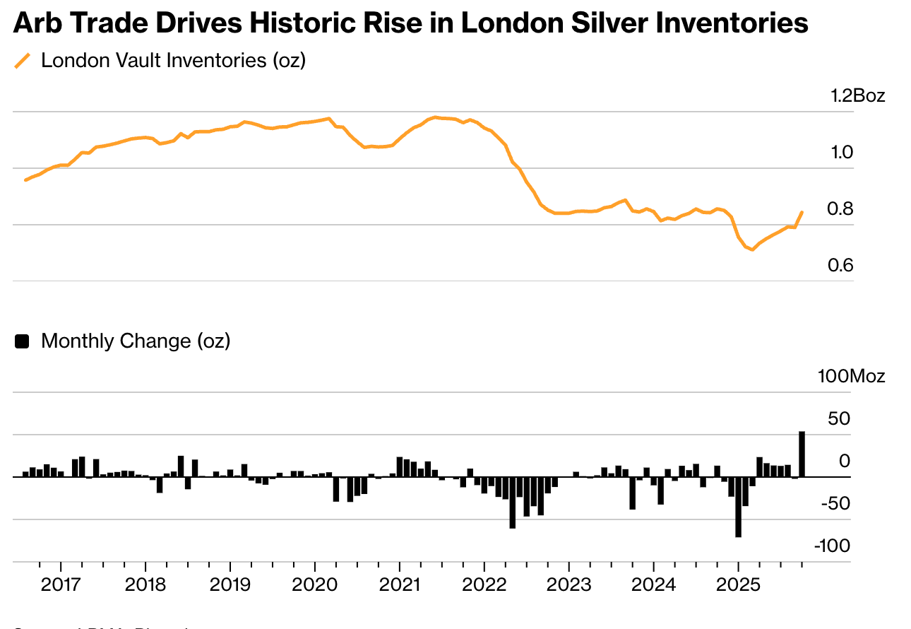 Vaults underpinning the London market added nearly 54 million troy ounces of silver in October, an amount weighing more than 100 of the UK capital’s iconic double-decker buses.