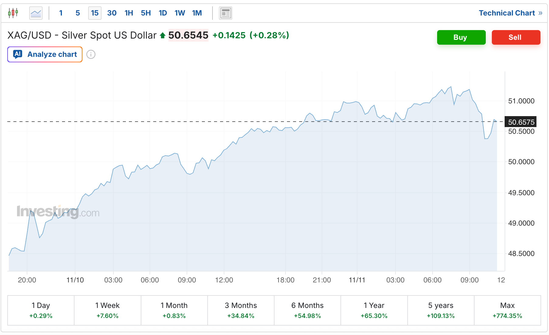 Both the silver futures and the silver spot price had crossed over the $51 level this morning, although they have also sold off, but remain in positive territory on the day.