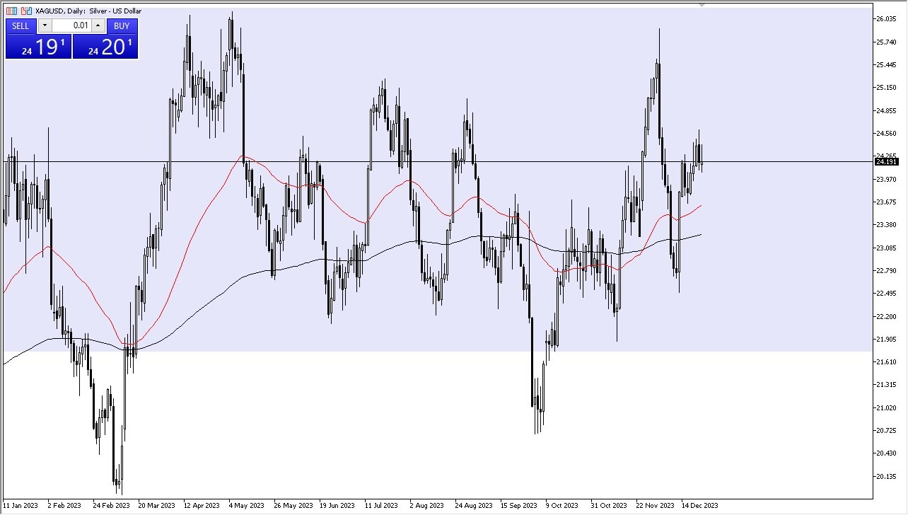 Overall, the silver market continues to exude strength, and traders are likely to seek opportunities to participate in this upward trajectory, despite the occasional retracements that may surface along the way. This should continue to be thought of as a buying opportunity, as the bond markets are showing that rates should continue to drop in the ten-year bond markets, and this should continue to help silver.