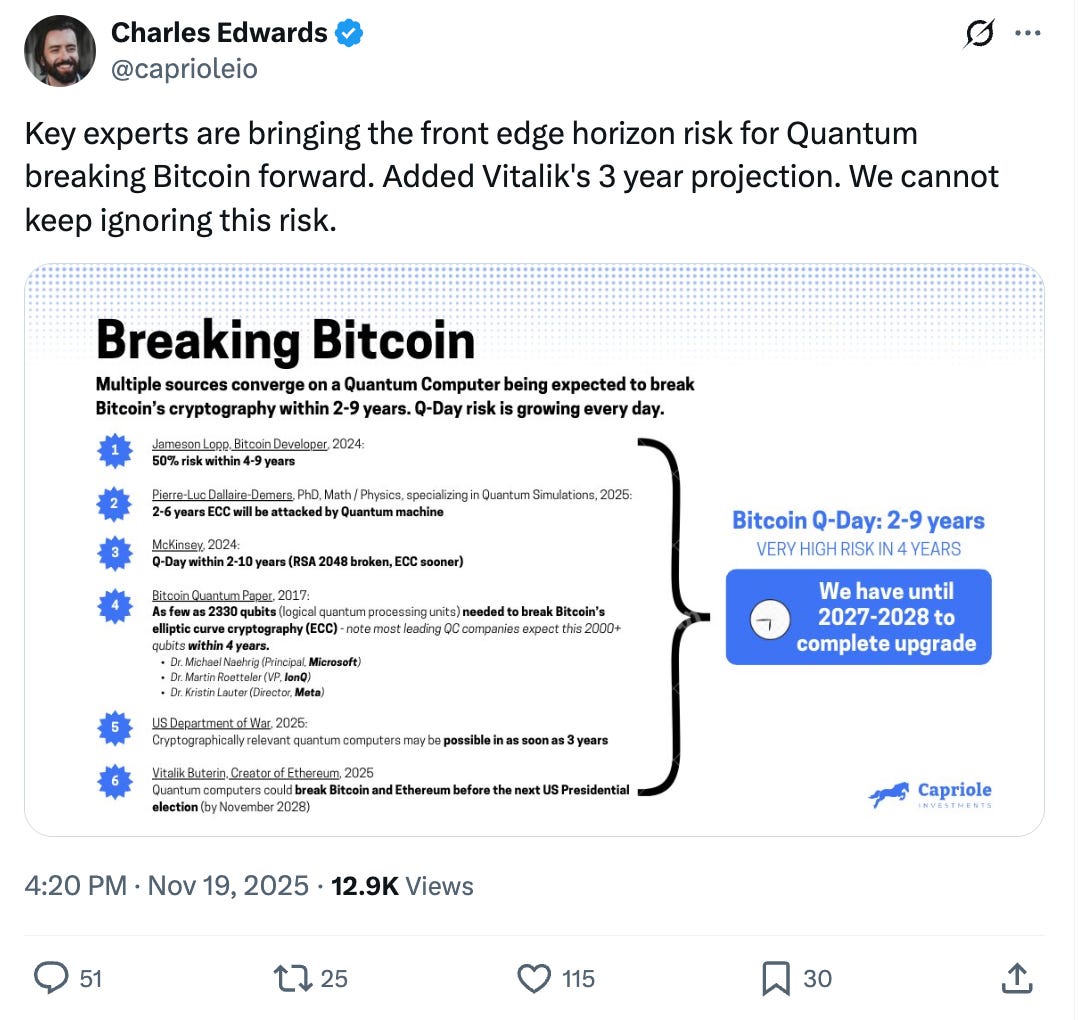 Luke talks often about how he had held a large Bitcoin position, although he pared that down when he recently saw indications that a decline might be ahead. And then in last week’s newsletter, he talked about one of the reasons that might account for the recent decline, as some of the quantum computing experts he follows are now raising concerns about a potential Bitcoin vulnerability to quantum computing.