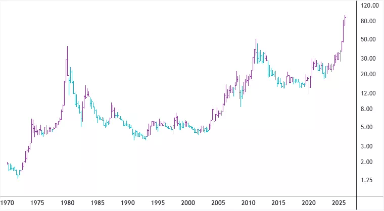 Price of Silver and Silver to Gold Ratio – Monthly Chart