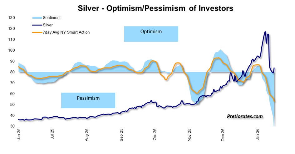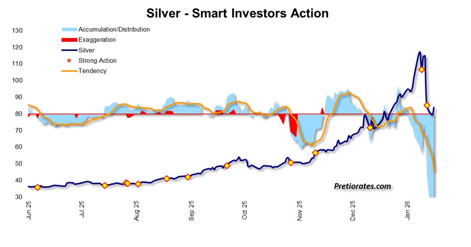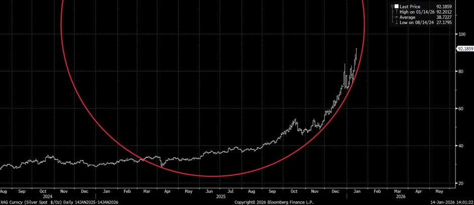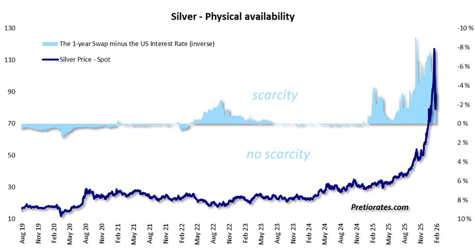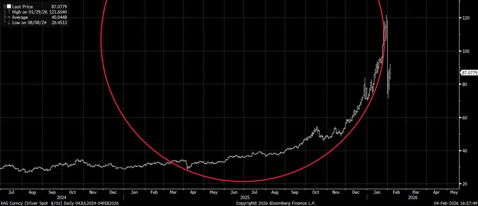 This chart basically explains why Kevin Warsh’s appointment as Fed chairman is not primarily responsible for the massive correction in precious metals and cryptos. Let’s be honest: two classic patterns emerged again that investors should never have fallen for. Almost everyone was sitting on lavish book profits in silver. At the same time, everyone knew that the market was massively overbought and overheated. So some were just waiting for the final trigger to secure their profits—which then usually comes too late... Others continued to dream of further advances that would catapult the price of silver to previously unimagined heights.