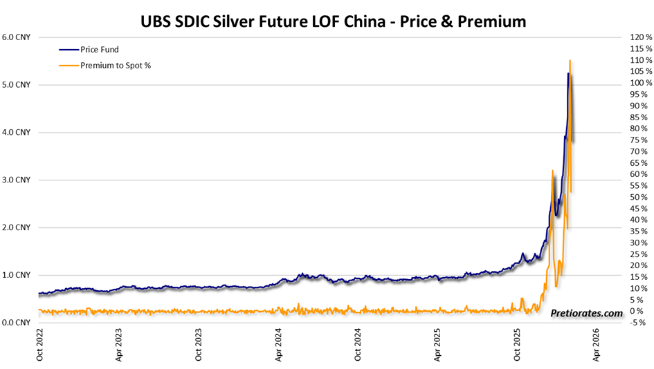 The premiums on the only silver ETF available in China are even more spectacular: the premium is currently just over 50%, and in recent days has at times even exceeded 100%.
