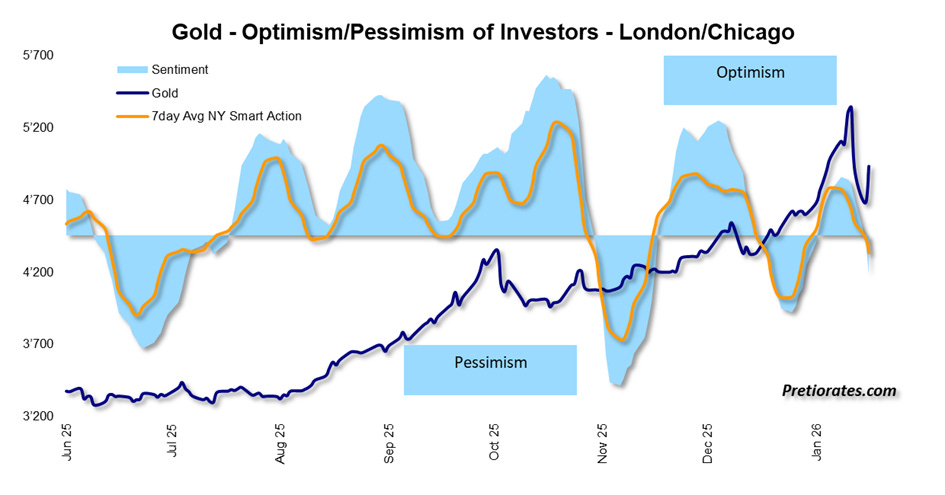 Physical gold trading in Shanghai was already showing signs of significant overheating before the sell-off: whenever the yellow dots, known as «strong actions», appear at the same time as the red areas, known as «exaggerations», the end of a short-term trend is usually not far off. The sharp sell-off was followed by a pronounced «exaggeration» on the selling side, which heralded the technical recovery we are currently seeing.