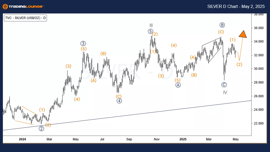 On the daily chart, Silver completed the cycle degree wave III in October 2024. After reaching the 2024 high, the price entered a corrective move — cycle degree wave IV — to retrace the wave III advance that began in October 2023. Wave IV unfolded as a zigzag pattern and concluded above $28 in April 2025.