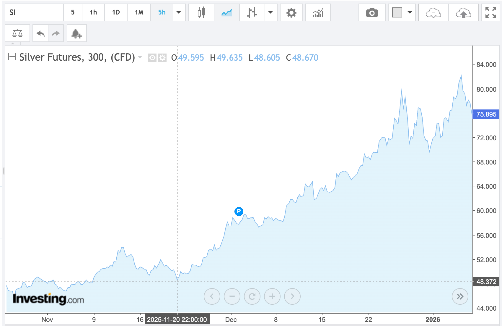 The silver futures were down to $48.60 on November 20th, and last night on January 20th, they set another new all-time record high of $95.77.