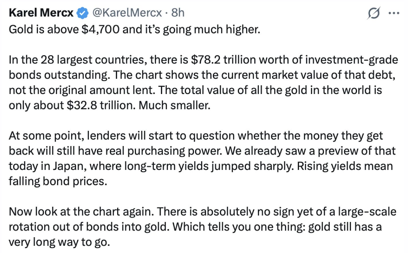 Takeaway: Silver may be the momentum trade, but gold is becoming the structural trade, and in a world of geopolitical fracture and accelerating de-dollarization, central banks are likely to keep the bid under gold for years.