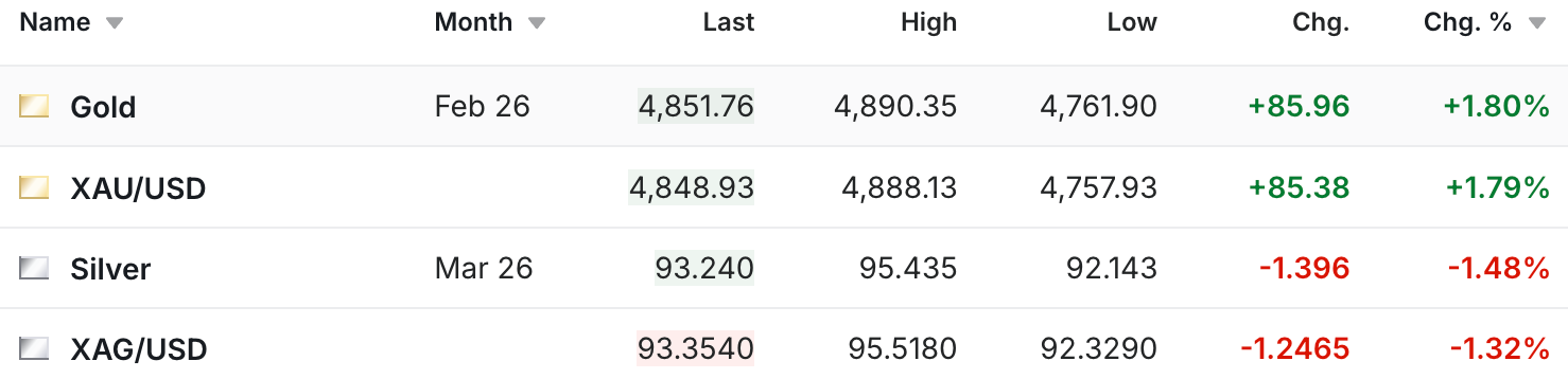 We’re seeing more movement in the gold and silver pricing on Wednesday, this time with some divergence, as the gold futures are currently up $86, while the silver futures are down $1.40.
