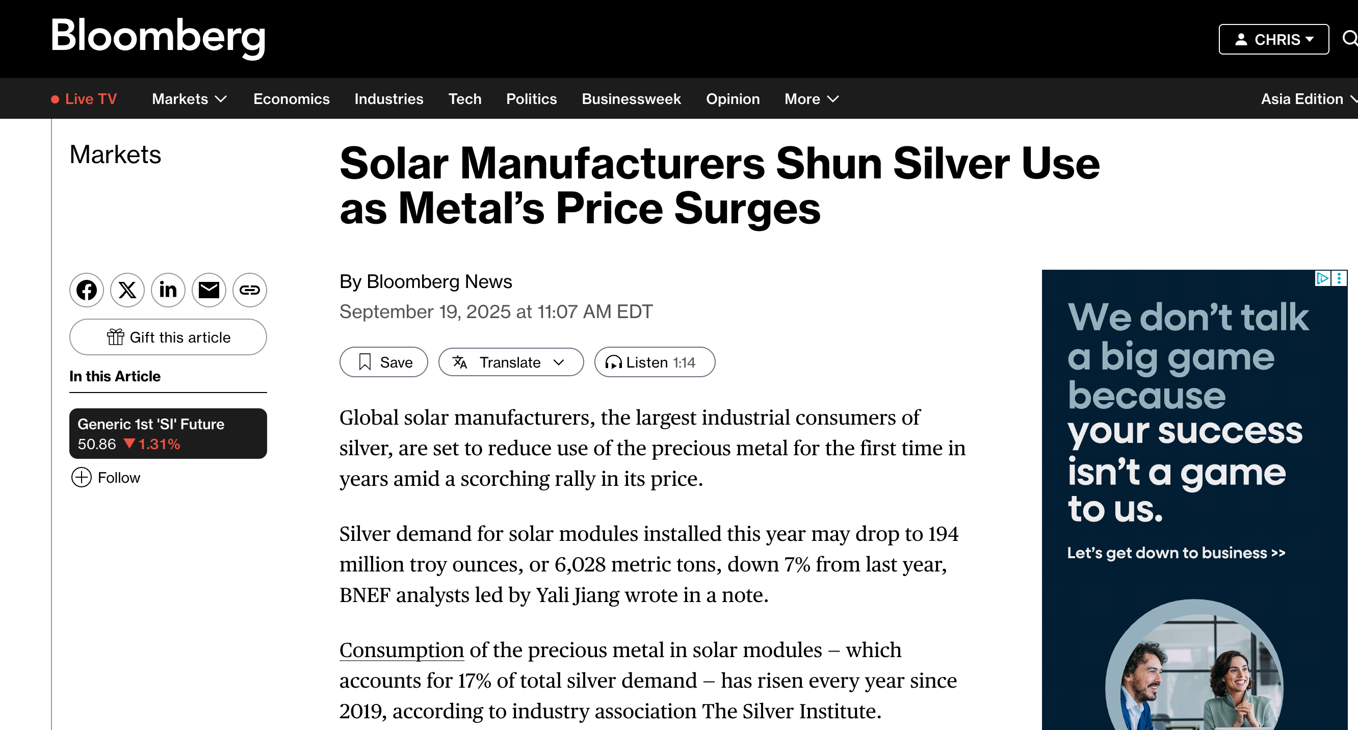 I know there are people out there that are concerned that the Fed might not cut rates in December. But aside from whether the Fed cuts at the next meeting before Trump eventually gets his guy in there who makes that decision irrelevant, I mentioned earlier this week how I’ve been collecting some notes on the silver/solar panel market, where thrifting efforts have kicked into overdrive.