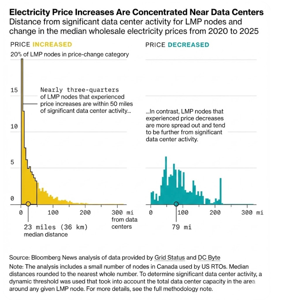 When supply is diminished and demand is skyrocketing “non-linearly,” prices go up. According to Bloomberg data and reporting, wholesale electricity prices near major data center hubs have spiked by as much as 267%.
