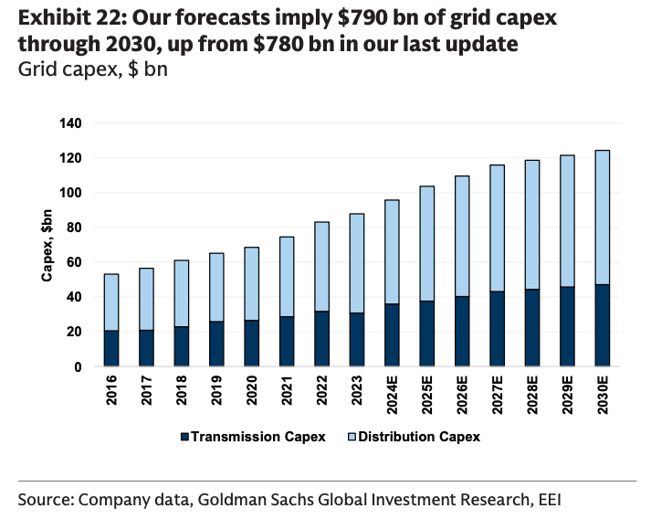 Goldman Sachs estimates that $790 billion in grid upgrades through 2030 will be required to support this new load. This isn’t just government spending, it’s rate-base growth for IOUs. In the regulatory world, utilities make money by spending money on approved infrastructure.