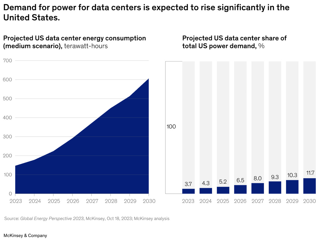 McKinsey projects that data center power demand in the U.S. will reach more than 600 terawatt-hours by 2030. To put that in perspective, that’s nearly 12% of the total U.S. power demand. That is the consumption equivalent to adding entire countries’ demand levels to the U.S. grid, all from AI-driven demands, in the span of only a few years.