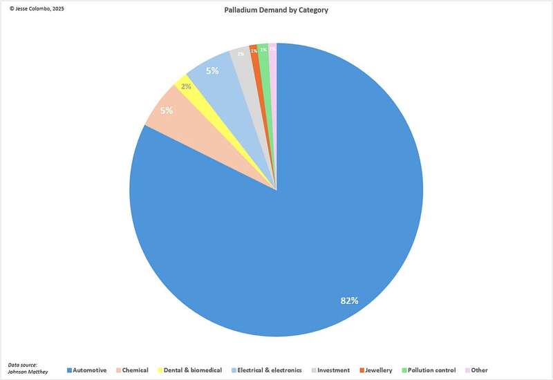 The vast majority, approximately 82%, is driven by the automotive sector through its use in catalytic converters. Another 5% comes from chemical manufacturing, 5% from electronics, and just 1% from jewelry.
