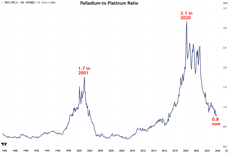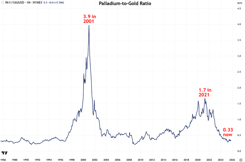 Along those lines, it is also useful to compare other platinum group metals to the leader of the group, which is platinum. By that measure, palladium is trading at very low relative levels and remains far below its peaks in 2001 and 2020.