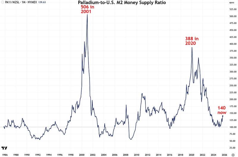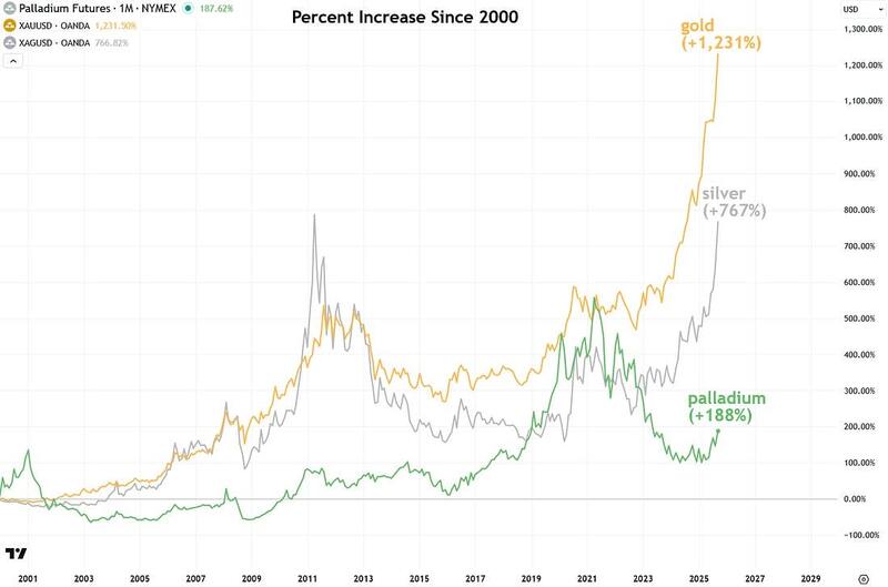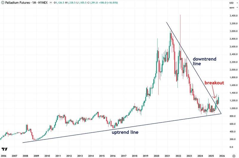 During this period, gold has gained 1,231%, silver 767%, while palladium has risen by only 188%. However, as palladium’s bull market gains momentum, this performance gap is likely to narrow.