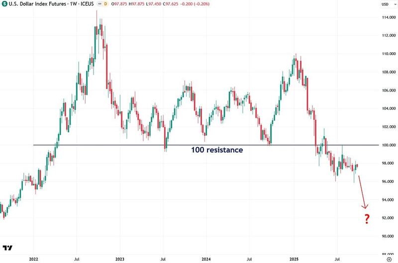 Another significant catalyst poised to drive all precious metals, including palladium, higher is a potential bear market in the U.S. dollar. The dollar and commodities, including precious metals, typically move inversely, meaning a bearish trend in the dollar is bullish for commodities, and vice versa.
