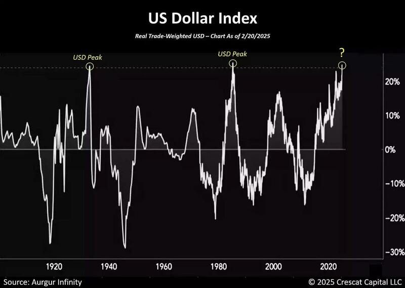 I foresee a substantial bear market for the dollar in the near future, driven by its extreme overvaluation relative to more than a century of historical data. Such pronounced overvaluation has only occurred twice before, in 1933 and 1985, and each time it was followed by substantial dollar declines.
