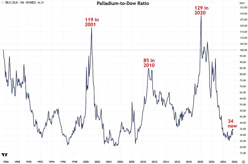 Multiple metrics indicate that commodity prices are currently exceptionally undervalued, aligning palladium’s low prices with this broader trend. One key metric is the commodities-to-Dow ratio, which highlights that commodities remain significantly undervalued compared to stocks.