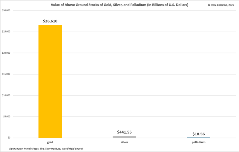 The total value of above-ground gold stock stands at an impressive $26.6 trillion, silver at $442 billion, and palladium at a mere $18.56 billion, as shown in the chart below. This small scale is one of the reasons why central banks and major institutional investors largely overlook palladium, favoring gold as their preferred asset.