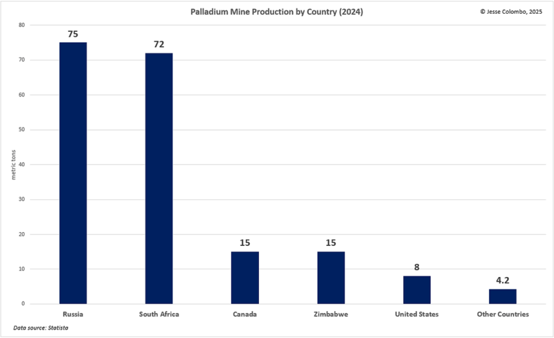 The palladium market’s volatility is further amplified by its heavy reliance on mine production concentrated in just a few countries. Russia led in 2024 with 75 metric tonnes, followed by South Africa with 72 metric tonnes. Canada and Zimbabwe each produced 15 metric tonnes, while the United States contributed only 8.