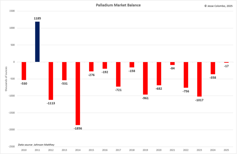This persistent deficit has greatly depleted above-ground inventories, leaving the palladium market vulnerable to extreme price spikes such as those seen in 2019–2021.