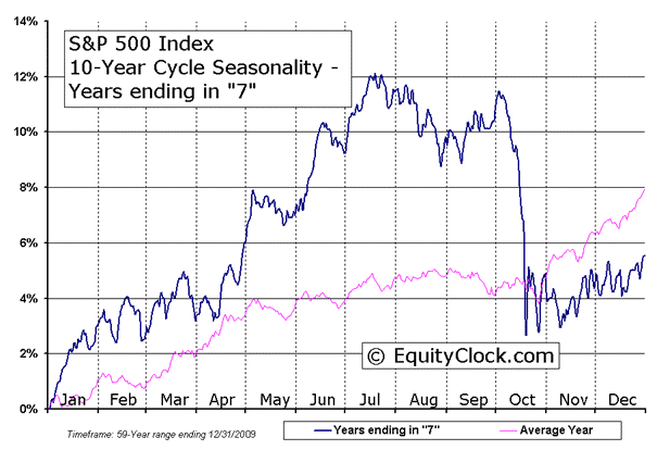 Given the years ending in seven and their propensity for panics and crises, it might not be a surprise that seasonality also plays a role. According to research carried out by Don Vialoux and Jon Vialoux of Equity Clock and Timing the Market the markets' ten-year cycle seasonality for years ending in seven is quite negative. The two charts below draw this phenomenon quite nicely.