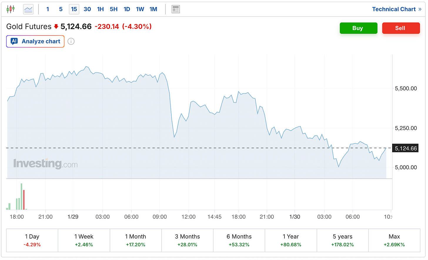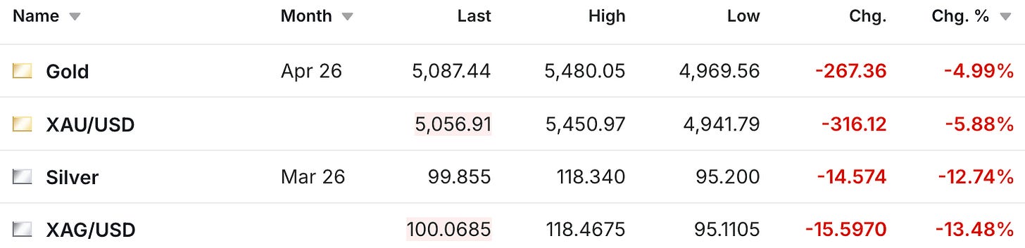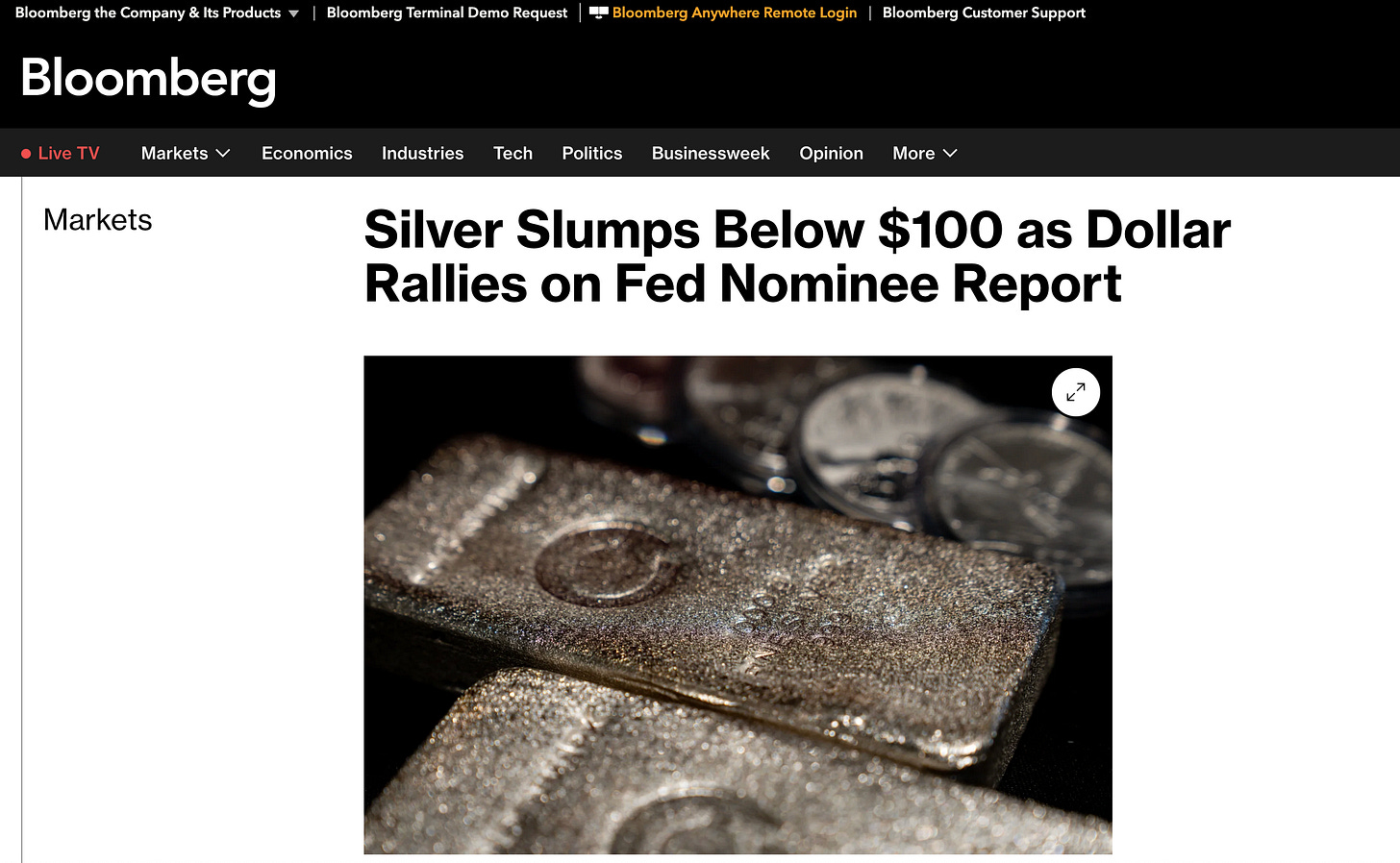 The gold and silver prices are in the midst of one of their largest (at least by dollar amount) moves downward this morning, which the Wall Street media is attributing to the nomination of Trump’s new Fed chair candidate.