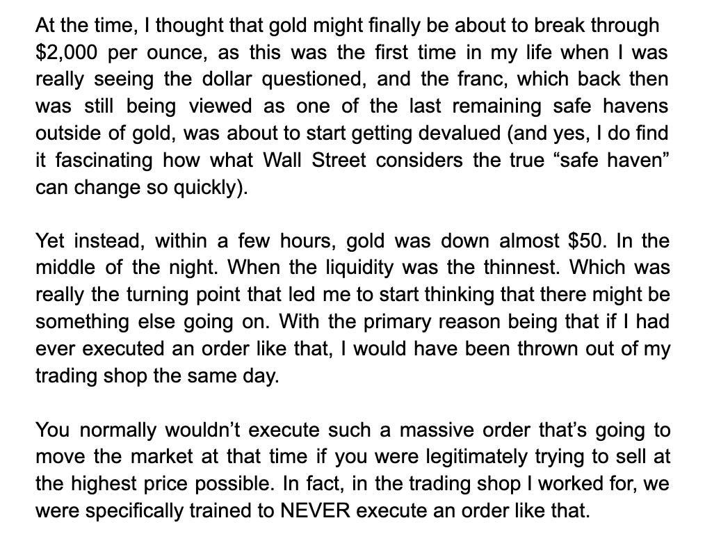 In terms of some of these instances where we see enormous sell offers dropped on the market that jolt the price lower, here’s what I wrote in the foreword of my book The Big Silver Short.