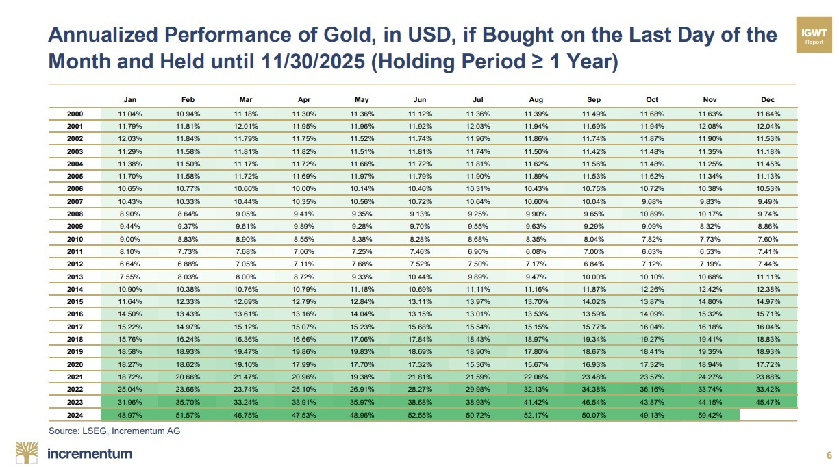 The following chart shows what would have happened if we had bought gold at nearly any time in this century. The numbers are a little hard to read, but the color (green) is what matters: No matter when someone bought gold since 2000, they’re up, and the rate of gain is accelerating.