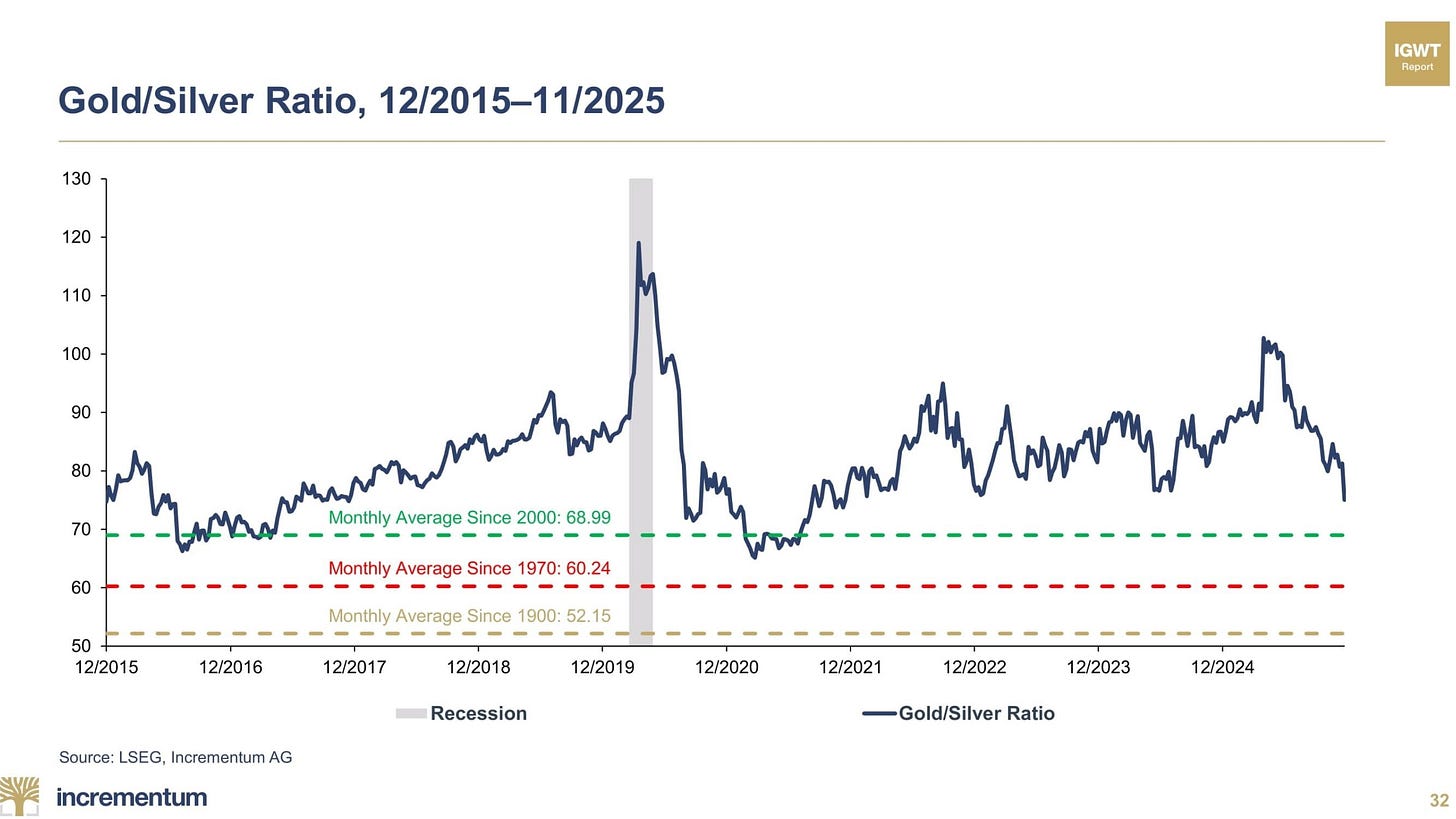 They were right. Silver has been outperforming gold, and the gold/silver ratio is falling hard. BUT it remains above past averages, which means it’s still undervalued, both on its own and relative to gold: