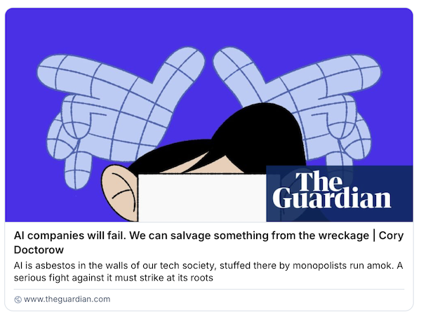 At the same time, the stock market is increasingly vulnerable to a bursting asset bubble. As Cory Doctorow writes, “AI is a bubble and it will burst. Most of the companies will fail. Most of the datacenters will be shuttered or sold for parts… As Stein’s law has it: ‘Anything that can’t go on forever eventually stops.'”
