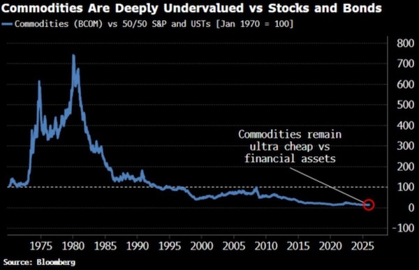 As such, “It’s the perfect environment for commodities to forge a generational outperformance over financial assets. Hard assets climb in real terms, while stocks and bonds, denominated in increasingly debauched, unbacked currencies, fall further behind,” writes Simon White.