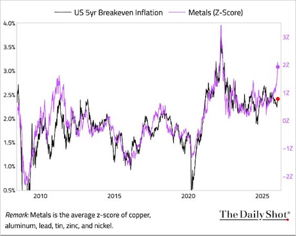 The return of inflationary pressures is something the metals markets are already warning about. “The gap between breakeven inflation and metal prices persists. Will metal prices fall, or will breakeven inflation rise?” asks The Daily Shot.
