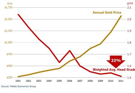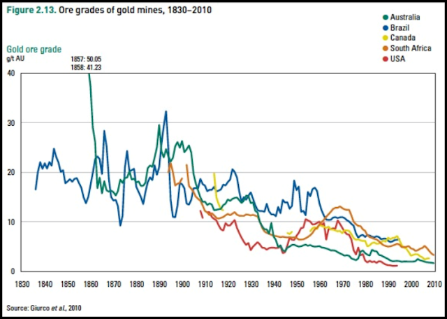 The oil problem becomes compounded with its evil twin, the other big problem with the modern gold miner - declining ore grades: