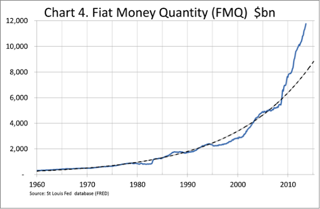 Here we have the gold price plotted vs FMQ (Fiat Money Quantity) and we see that the 1970's gold bull, which wasn't about fiat, solidly out-performed fiat money. Then the proliferation of fiat really began in the year 2000, when our present gold bull began: