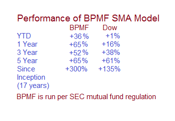 I'd like to post a correction. In the BPMF data, I was going by some charts that are part of a switchover to the FOLIOfn website and they were showing some incorrect data. The YTD figure is +10% and one year is +32% and 5 year is +35%. Since inception is correct.