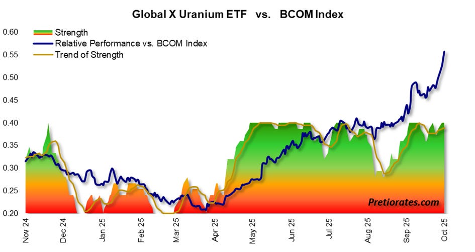 Uranium, one of the heaviest metals of all, remained a niche topic for a long time. But the plans of tech giants to build energy-hungry data centers around the world have changed that. With Russian supplies now off limits, the price has skyrocketed. For nuclear power plants, however, this is of secondary importance: fuel costs account for only around five percent of total costs – but they are by no means dispensable. Uranium significantly outperformed the Commodity Index.