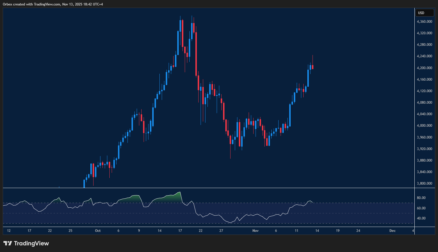 As Gold hit another fresh high, investors digested the end of the government shutdown. With the restart of key economic data releases, which could reinforce expectations of further interest rate cuts. Sentiment could struggle to attract sellers below 4000, as this price now becomes a critical level of support. The yellow metal is targeting 4280 to sustain the rally and move towards another record.